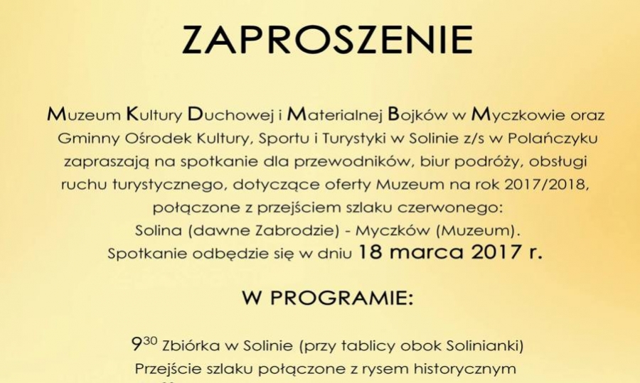 MYCZKÓW, BIESZCZADY. Muzeum Kultury Duchowej i Materialnej w Myczkowie oraz GOKSiT w Solinie z/s w Polańczyku zapraszają w sobotę, 18 marca na spotkanie dla przewodników, biur podróży, obsługi ruchu turystycznego. dotyczące oferty muzeum na rok 2017/2018.